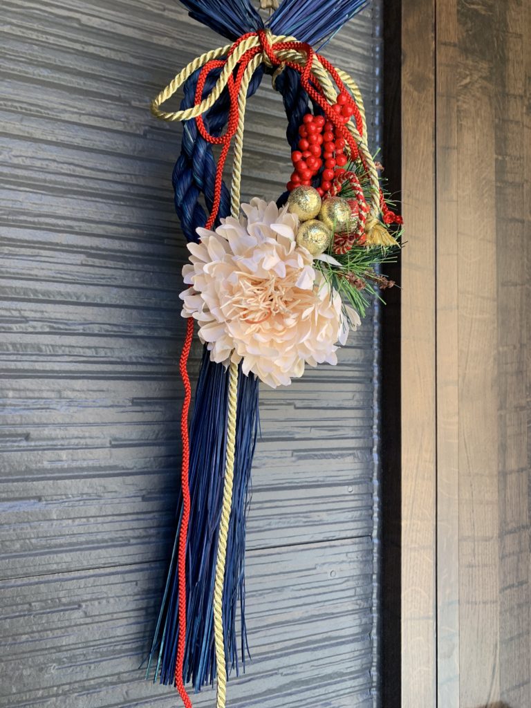 今年のしめ縄はブルーに、ゴールドとレッド。